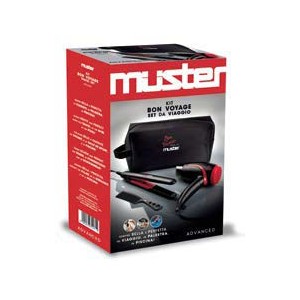 Set de viaje profesional Kit Bon Vayage Travel Set by Muster ideal para llevar de viaje, gimnasio y piscina Incluye: Secador con mango plegable 1000 W Phon de viaje con boquilla direccional y extraíble, filtro posterior extraíble para la limpieza, cable de 2 m, 17 cm de longitud y 240 g de peso Mini-plancha 35 W lisa y enrolla el pelo en suaves ondas, con placas revestidas de cerámica extra delicadas en cerámica pelo, cable de 2 m, longitud 24 cm, peso 150 g Peine negro perfilado con asa, largo 17,5 cm Beauty bag con asa de transporte bolso con asa que contiene todos los accesorios, largo 26 cm, peso 580 g (kit completo)